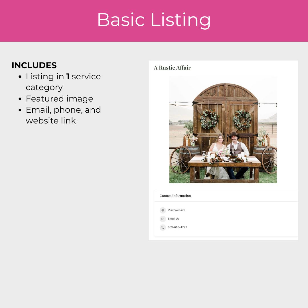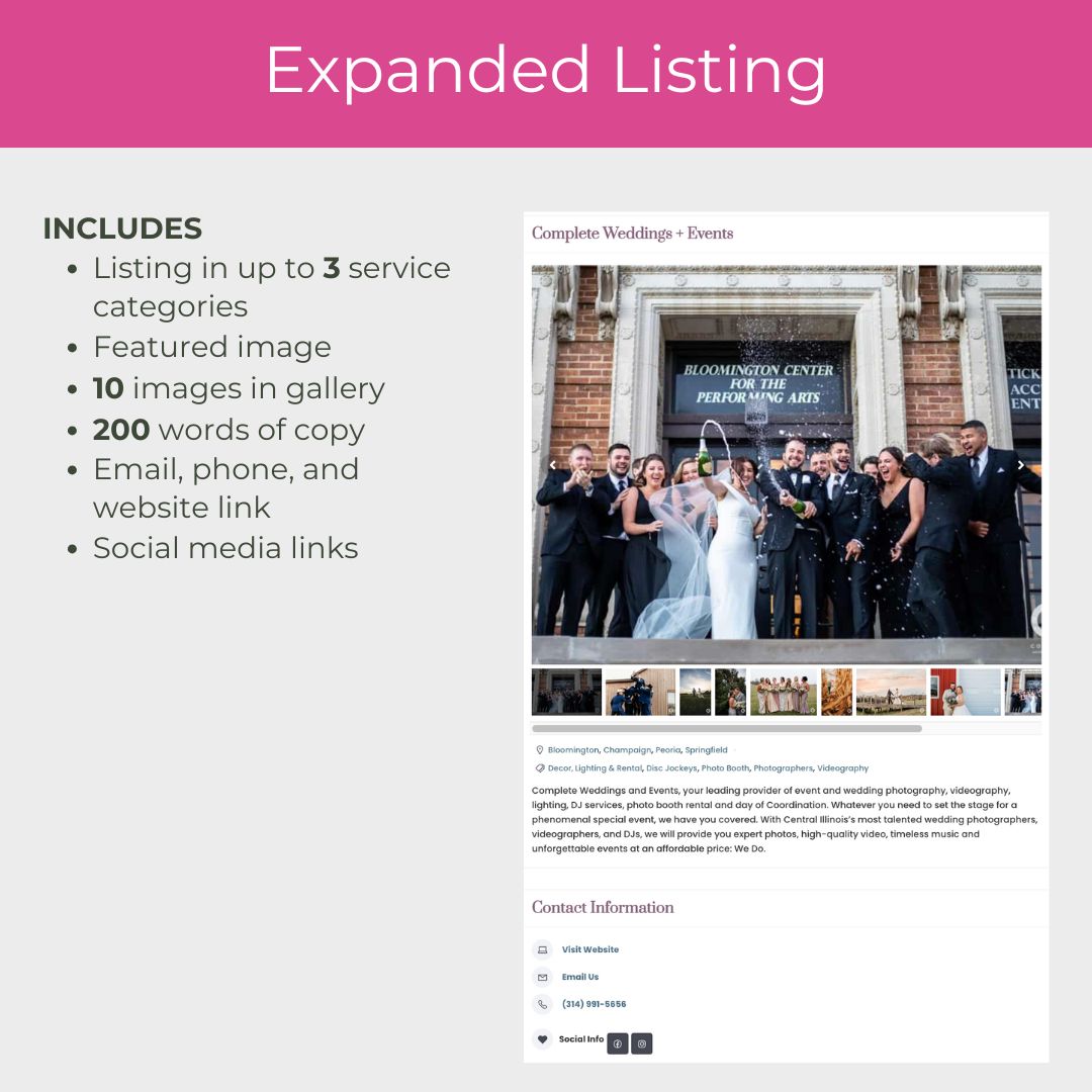 Our Expanded Listing includes 1 featured image, up to 10 images in a gallery, a 200 word description of your company, link to your website, email link, phone number, and links to your social media. Your listing will be included in up to three relevant categories.