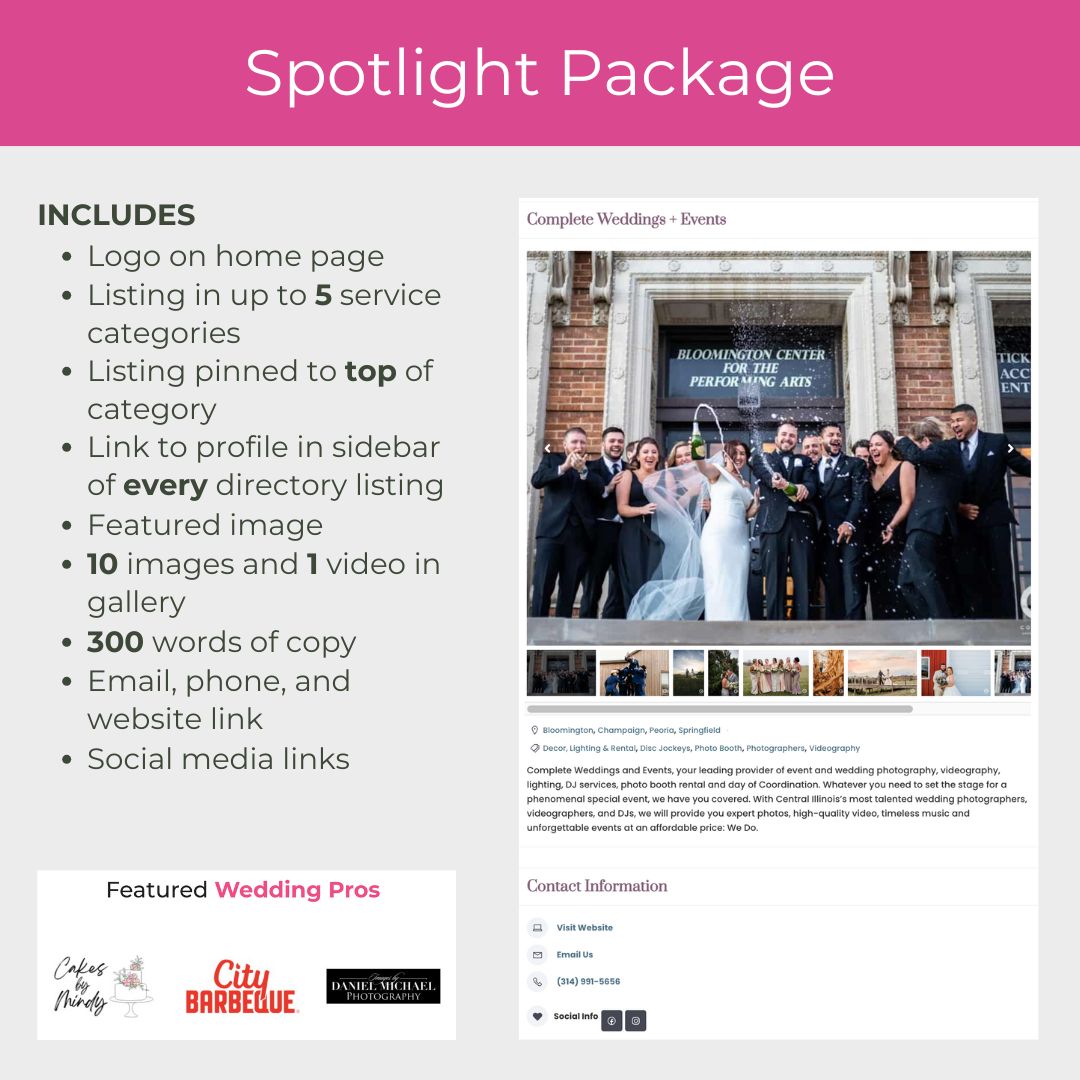 Our Spotlight Package includes everything described in the Expanded Listing. In addition, your listing will be pinned to the top of the category, and a link to it will appear on every profile page in the directory. Your logo will also be included in the Featured Exhibitors section.